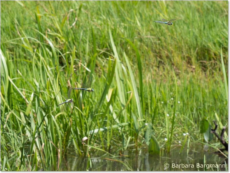Manchmal jagen die Männchen der Grünen Mosaikjungfer in Gruppen. Unten sehen Sie drei Männchen beim gemeinschaftlichen Jagen nach Insekten. Die Grüne Mosaikjungfer kann auch beim Schlafen Gemeinschaften bilden, dann sind bis zu fünf Libellen an einer Stelle, sie kriechen rückwärts tief in die Vegetation. Erst am Morgen kommen sie wieder raus und warten zusammen auf die Sonne. Nur wenn es warm genug ist, können die Libellen fliegen.