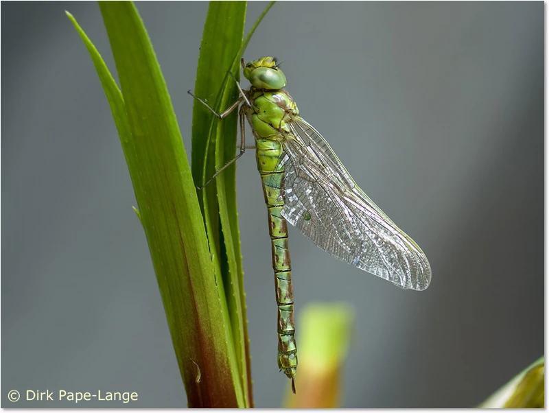 Ab Mitte Juni bis Ende Juli schlüpft die Grüne Mosaikjungfer. Sie schlüpft immer an der eigenen Krebsschere dicht über dem Wasser. Das Weibchen, auf dem Foto unten, ist gerade aus seiner Haut (Exuvie) geschlüpft und pumpt nun die Flügeladern mit Körperflüssigkeit auf. Wenn die Flügel die maximale Größe erreicht haben, härten die Flügel komplett aus. Die jetzt noch milchigen Flügel werden dann glasklar.